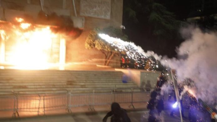 Ai deklaron se pas mbarimit te fjalimit të liderit të opozitës, një grup protestuesish të maskuar kanë hedhur drejt tyre dhe godinës se kryeministrisë ënde piroteknike dhe molotov si dhe sende të forta.