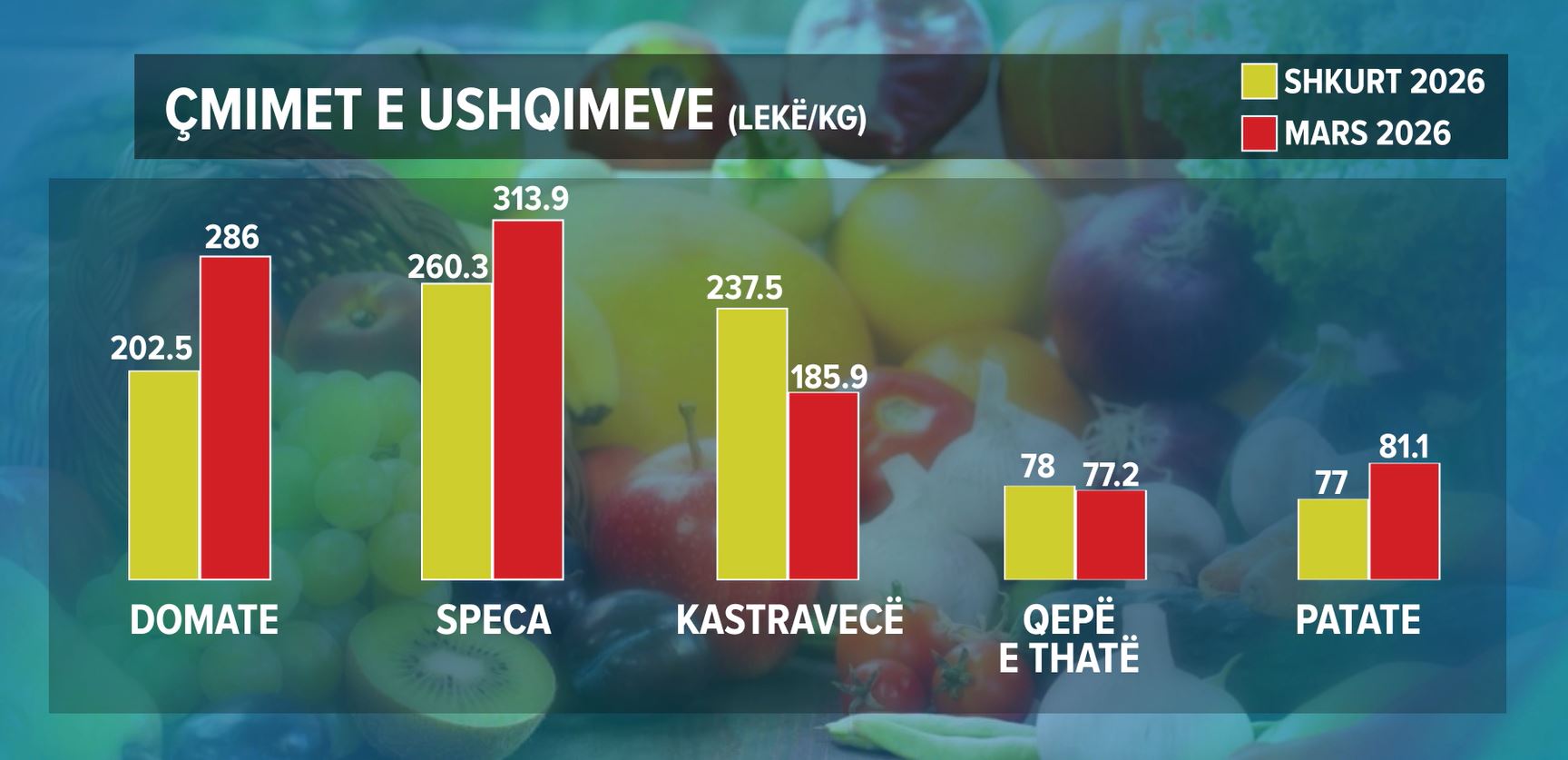 Rritja më e theksuar u regjistrua tek domatet, të cilat u shtrenjtuan me 29% brenda një muaji, duke arritur në 286 lekë për kilogram nga 202.5 lekë në shkurt, referuar çmimeve mesatare të publikuara nga Instituti i Statistikave. Ky është çmimi më i lartë i regjistruar ndonjëherë për këtë produkt, që u kthye në ‘trend’ muajin e kaluar pasi disa ditë u tregtua deri me 400 lekë.