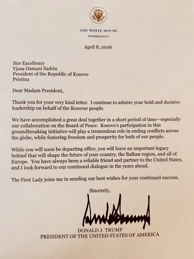 “Kemi arritur shumë së bashku në një periudhë të shkurtër kohore-veçanërisht bashkëpunimin tonë në kuadër të Bordit të Paqes. Pjesëmarrja e Kosovës në këtë nismë të re premtuese do të luajë një rol të jashtëzakonshëm në përfundimin e konflikteve në mbarë botën, duke promovuar njëkohësisht lirinë dhe mirëqenien për të dy popujt tanë. Po lini pas një trashëgimi të rëndësishme që do të formësojë të ardhmen e vendit tuaj, rajonit të Ballkanit, dhe gjithë Evropës. Ju keni qenë gjithmonë një mike dhe partnere e besueshme e Shteteve të Bashkuara, dhe mezi pres vazhdimin e bashkëpunimit tonë në vitet në vijim”, shkruhet në letrën e dërguar nga presidenti.