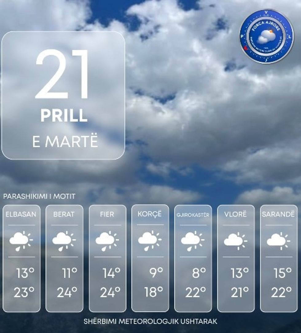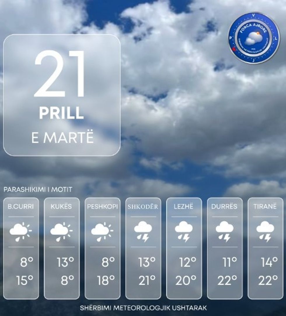 Shërbimi Meteorologjik Ushtarak bën të ditur se Shqipëria të martën do të vijojë të ndikohet nga kushte atmosferike të paqëndrueshme.