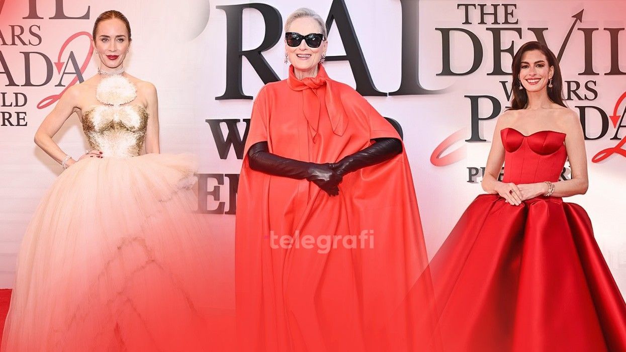 Meryl Streep u shfaq me një fustan të kuq të ndezur, doreza të zeza dhe syzet karakteristike të personazhit të saj Miranda Priestly, duke ruajtur stilin e fuqishëm të kryeredaktores së “Runway”.