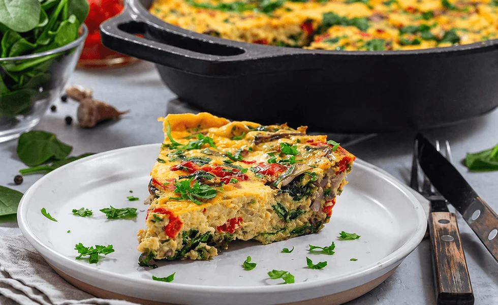 • Fillimisht, përvëlojeni shkurt spinaqin, kullojeni mirë nga uji i tepërt dhe priteni trashë. Specat e pjekur pastrojini dhe pritini në copa të vogla. Në një enë të thellë rrihni vezët me mikser derisa të bëhen shkumë, pastaj shtoni kosin dhe vajin, duke i përzier lehtë me shpatull që masa ta ruajë volumin.