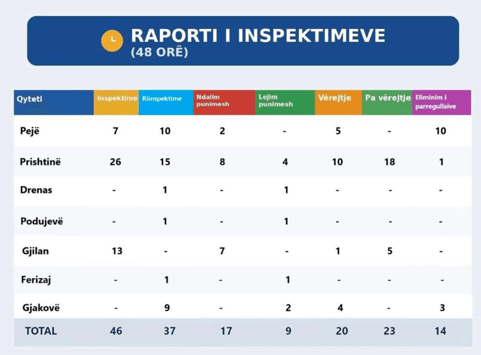 “Vërejtje: Në këtë 48 orësh fokus i Inspektimit ka qenë sektori i ndërtimtarisë andaj edhe realizimi i inspektimeve është bërë në 100% në këtë sektor. Në kolonën ku është cekur numëri total i ndalimeve të punimeve nënkupton me automatizëm edhe numrin total të kërkesave për kundërvajtje. Në përfundim të Aksionit të gjitha subjektet që kanë rezultuar me ndalim të punimeve me automatizëm procesohen në Gjykatat për kundërvajtje përkitazi me shkeljet e konstatuara. Procesi i Riinspektimeve do të kryhet në ditët në vijim të aksionit sipas afateve kohore të përcaktuara nga Inspektorët për eliminim të parregullësive. Eleminim të parregullësive nënkupton procesin kur subjekti i inspektuar ka ndërmarrë veprime në përmirësim të gjendjes së Sshp-së”, thuhet në njoftim. /Telegrafi/