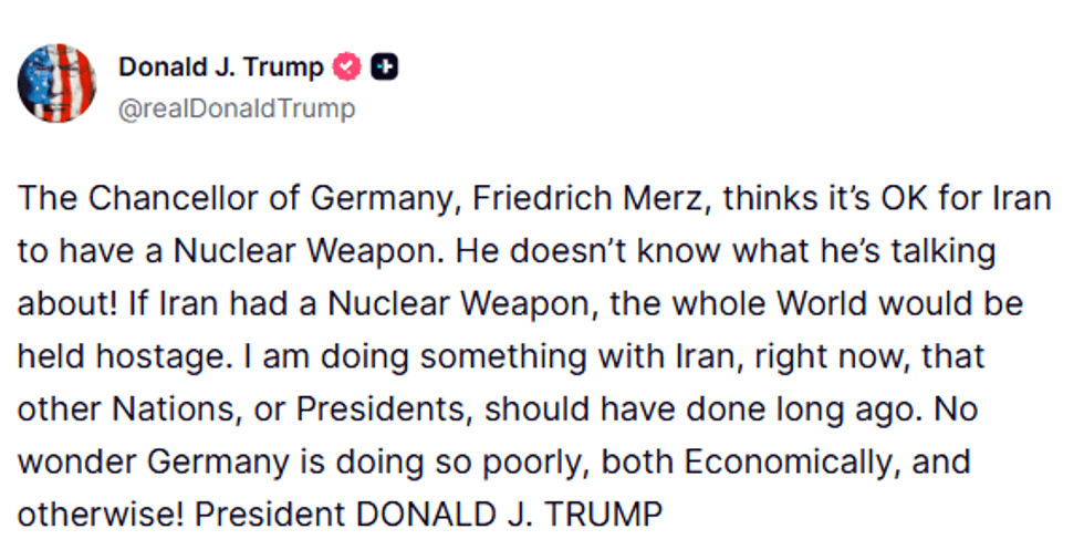 “Kancelari i Gjermanisë, Friedrich Merz, mendon se është në rregull që Irani të ketë një armë bërthamore”, shkroi presidenti amerikan.