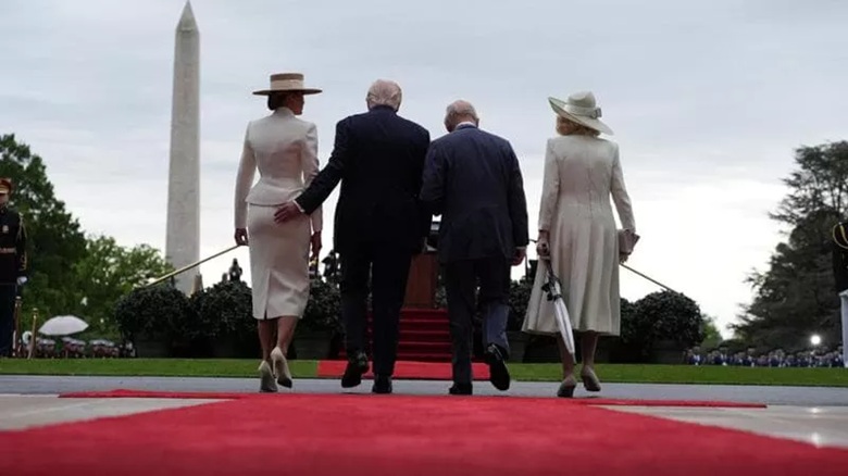 Edhe Zonja e Parë dhe Mbretëresha po marrin pjesë në përpjekjen për të riparuar dëmtimet në “marrëdhënien speciale” mes Shteteve të Bashkuara dhe Britanisë së Madhe. Për ceremoninë zyrtare të mirëseardhjes në Shtëpinë e Bardhë, Melania dhe Camilla ishin të dyja të veshura me të bardha. Të dyja mbanin një kapele me strehë, megjithëse ajo e Zonjës së Parë e fshihte më shumë fytyrën, siç e ka zakon. Camilla, ndërkohë, mbante një çadër: një aksesor i dobishëm, pasi në Uashington ka erë. Si retë metaforike mbi marrëdhënien e krisur mes dy vendeve? Trump bëri shaka me këtë duke e nisur kështu fjalimin e tij: “Sot është një ditë e bukur britanike”, dhe të gjithë shpërthyen në të qeshura, duke thyer akullin.